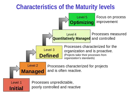 CMMI defines the following five maturity levels (1 to 5) for processes: Initial, Managed, Defined, Quantitatively Managed, and Optimizing. CMMI Version 3.0 was published in 2023;[1] Version 2.0 was published in 2018; Version 1.3 was published in 2010, and is the reference model for the rest of the information in this article. CMMI is registered in the U.S. Patent and Trademark Office by CMU.[2]