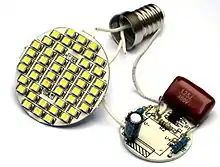 By changing the value of the example in the diagram by a capacitor with a value of 330 nF, a current of approximately 20 mA can be provided, as the reactance of the 330 nF capacitor at 50 Hz calculates to and applying Ohm's law, that limits the current to . This way up to 48 white LEDs in series can be powered (for example, 3.1 V/20 mA/20000 mcd).