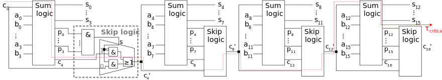 As the propagate signals are computed in parallel and are early available, the critical path for the skip logic in a carry-skip adder consists only of the delay imposed by the multiplexer (conditional skip).