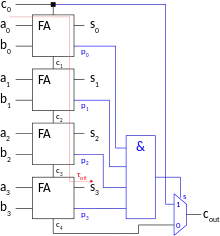 A carry-skip adder[nb 1] (also known as a carry-bypass adder) is an adder implementation that improves on the delay of a ripple-carry adder with little effort compared to other adders. The improvement of the worst-case delay is achieved by using several carry-skip adders to form a block-carry-skip adder.