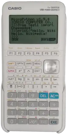 The Casio fx-9860G is a series of graphing calculators manufactured by Casio, successor of the fx-9750G PLUS/CFX-9850 PLUS/CFX-9950 PLUS/CFX-9970 family of calculators. All of them are capable of being programmed by means of sophisticated languages and tools including assembly language, Basic variants, and ports of programming languages such as C, as well as hosting add-ins which are compiled on a computer and then downloaded to the calculator.[1]