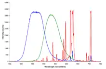 - ↑ Yen, William M.; Shionoya, Shigeo; Yamamoto, Hajime (2006). Practical Applications of Phosphors. CRC Press. p. 211. ISBN 978-1-4200-4369-3.