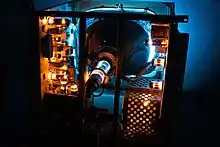 The electron gun emits the electrons that ultimately hit the phosphors on the screen of the CRT. The electron gun contains a heater, which heats a cathode, which generates electrons that, using grids, are focused and ultimately accelerated into the screen of the CRT. The acceleration occurs in conjunction with the inner aluminum or aquadag coating of the CRT. The electron gun is positioned so that it aims at the center of the screen.[188] It is inside the neck of the CRT, and it is held together and mounted to the neck using glass beads or glass support rods, which are the glass strips on the electron gun.[22][188][208] The electron gun is made separately and then placed inside the neck through a process called "winding", or sealing.[66][209][210][211][212][213] The electron gun has a glass wafer that is fused to the neck of the CRT. The connections to the electron gun penetrate the glass wafer.[210][214] Once the electron gun is inside the neck, its metal parts (grids) are arced between each other using high voltage to smooth any rough edges in a process called spot knocking, to prevent the rough edges in the grids from generating secondary electrons.[215][216][217]