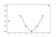The following is an implementation of the Catmull–Rom spline in Python that produces the plot shown beneath.