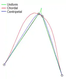 in which ranges from 0 to 1 for knot parameterization, and with . For centripetal Catmull–Rom spline, the value of is . When , the resulting curve is the standard uniform Catmull–Rom spline; when , the result is a chordal Catmull–Rom spline.