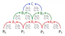 A3 = (t3 - t) / (t3 - t2) * P2 + (t - t2) / (t3 - t2) * P3