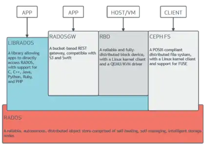 The "librados" software libraries provide access in C, C++, Java, PHP, and Python. The RADOS Gateway also exposes the object store as a RESTful interface which can present as both native Amazon S3 and OpenStack Swift APIs.