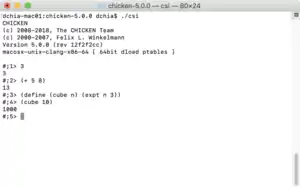 ![]() Chicken 5.0.0 interpreter running on macOS | |