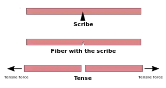 The general method of cleaving involves a general strategy known as the scribe-and-tension or scribe-and-break strategy. This strategy involves the introduction of a small crack into the fiber and the subsequent application of a tensile force in the vicinity of the crack that causes the fiber to cleave.[4][5]