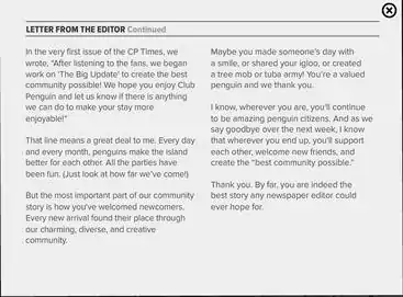- Megg (January 30, 2017). "Important Announcement Regarding Club Penguin on Desktop and Mobile Devices". Club Penguin. Archived from the original on March 28, 2017. Retrieved January 31, 2017.