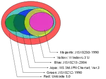 Euler diagram comparing repertoires of JIS X 0208, JIS X 0212, JIS X 0213, Windows-31J, the Microsoft standard repertoire and Unicode