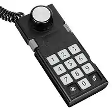 The Super Action Controller Set, available in September 1983, is a set of two handheld joystick controllers that comes packaged with the cartridge Super Action Baseball. Each controller has a ball-top joystick, four finger triggered action buttons, a 12-button numeric keypad, and a "speed roller".[34][35] The cartridges Super Action Football, Rocky Super Action Boxing, and a conversion of the arcade game Front Line are also designed to be used with the Super Action Controller.