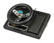 Expansion Module #2 is a driving controller (steering wheel / gas pedal) that comes packaged with the cartridge Turbo. The gas pedal is merely a simple on/off switch.[29] Although Coleco called the driving controller an expansion module, it actually plugs into the controller port, not the Expansion Module Interface.[30] The driving controller is also compatible with the cartridges Destructor, Bump 'n' Jump, Pitstop, and The Dukes of Hazzard.