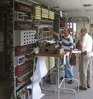 ![]() A Colossus Mark 2 computer being operated by Wrens.[lower-alpha 1] The slanted control panel on the left was used to set the "pin" (or "cam") patterns of the Lorenz. The "bedstead" paper tape transport is on the right. | |