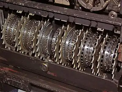 In order to decrypt the transmitted messages, two tasks had to be performed. The first was "wheel breaking", which was the discovery of the cam patterns for all the wheels. These patterns were set up on the Lorenz machine and then used for a fixed period of time for a succession of different messages. Each transmission, which often contained more than one message, was enciphered with a different start position of the wheels. Alan Turing invented a method of wheel-breaking that became known as Turingery.[19] Turing's technique was further developed into "Rectangling", for which Colossus could produce tables for manual analysis. Colossi 2, 4, 6, 7 and 9 had a "gadget" to aid this process.[20]