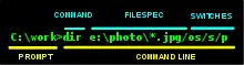| Windows | DIR/Q/O:S d* | dir /q d* /o:s | display ownership of files whose names begin with "D", sorted by size, smallest first. Note spaces around argument d* are required. |