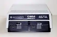 The Commodore 4040 is the replacement for the previous models 2040 (U.S.) and 3040 (Europe). It's a dual-drive 5¼" floppy disk subsystem for Commodore Business Machines. It uses a wide-case form, and uses the parallel IEEE-488 interface common to Commodore PET/CBM computers.
