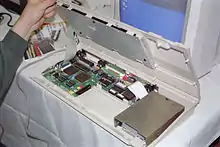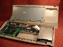The C65 includes the same ports of the C64. In addition, there is a DMA port for memory expansion. The latter is attached just like on the Amiga 500 via a flap in the bottom of the board.[10] The built-in floppy disk drive is connected in parallel, serial Commodore drives can be connected via the usual IEC port. A plug for a genlock was also provided. Only the port for the C64 datasette is no longer available, and the user port missing—like the Aldi C64—the 9 volt AC line. The expansion port differs significantly from all prior C64 variants and rather resembles that of C16.
