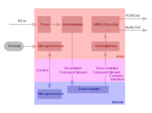 The Common Interface is the connection between the TV tuner (TV or set-top box) and the module that decrypts the TV signal (CAM). This module, in turn, then accepts the pay-to-view subscriber card, which contains the access keys and permissions.