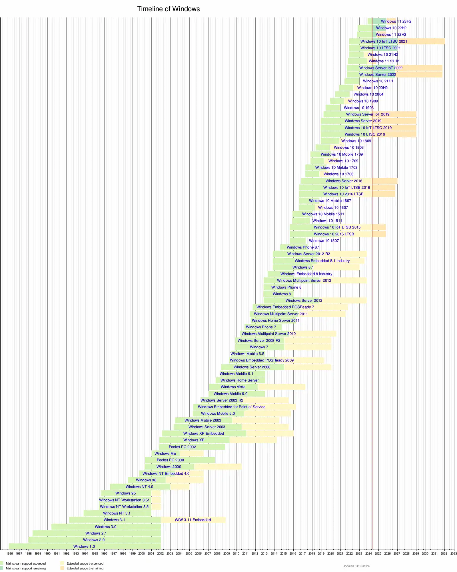 | Windows 3.1x | 1992-04-06 | 3.11 (1993-12-31) | Unsupported (2001-12-31) |