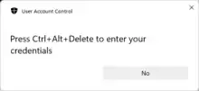 - Though it is not the default behavior for usability reasons, UAC may be configured to require the user to press Ctrl+Alt+Del (known as the secure attention sequence) as part of the authentication process. Because only Windows can detect this key combination, requiring this additional security measure would prevent spoofed dialogs from behaving the same way as a legitimate dialog.[16] For example, a spoofed dialog might not ask the user to press Ctrl+Alt+Del, and the user could realize that the dialog was fake. Or, when the user did press Ctrl+Alt+Del, the user would be brought to the screen Ctrl+Alt+Del normally brings them to instead of a UAC confirmation dialog. Thus the user could tell whether the dialog was an attempt to trick them into providing their password to a piece of malicious software.