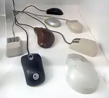 The earliest known written use of the term mouse or mice in reference to a computer pointing device is in Bill English's July 1965 publication, "Computer-Aided Display Control".[2] This likely originated from its resemblance to the shape and size of a mouse, with the cord resembling its tail.[3][4] The popularity of wireless mice without cords makes the resemblance less obvious.