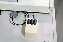 As noted above, the device was based on an earlier trackball-like device (also named Rollkugel) that was embedded into radar flight control desks.[36] This trackball had been originally developed by a team led by Rainer Mallebrein at Telefunken Konstanz for the German Bundesanstalt für Flugsicherung (Federal Air Traffic Control). It was part of the corresponding workstation system SAP 300 and the terminal SIG 3001, which had been designed and developed since 1963.[39] Development for the TR 440 main frame began in 1965.[41][39] This led to the development of the TR 86 process computer system with its SIG 100-86[35][33] terminal. Inspired by a discussion with a university customer, Mallebrein came up with the idea of "reversing" the existing Rollkugel trackball into a moveable mouse-like device in 1966,[39] so that customers did not have to be bothered with mounting holes for the earlier trackball device. The device was finished in early 1968,[39] and together with light pens and trackballs, it was commercially offered as an optional input device for their system starting later that year.[32][33][34][42] Not all customers opted to buy the device, which added costs of DM 1,500 per piece to the already up to 20-million DM deal for the main frame, of which only a total of 46 systems were sold or leased.[35][43] They were installed at more than 20 German universities including RWTH Aachen, Technical University Berlin, University of Stuttgart[44][45] and Konstanz.[40] Several Rollkugel mice installed at the Leibniz Supercomputing Centre in Munich in 1972 are well preserved in a museum,[35][46][36] two others survived in a museum at Stuttgart University,[44][37][36] two in Hamburg, the one from Aachen at the Computer History Museum in the US,[47][36] and yet another sample was recently donated to the Heinz Nixdorf MuseumsForum (HNF) in Paderborn.[48][43] Anecdotal reports claim that Telefunken's attempt to patent the device was rejected by the German Patent Office due to lack of inventiveness.[36][40][43][39] For the air traffic control system, the Mallebrein team had already developed a precursor to touch screens in form of an ultrasonic-curtain-based pointing device in front of the display.[39] In 1970, they developed a device named "Touchinput-Einrichtung" ("touch input device") based on a conductively coated glass screen.[40][39]