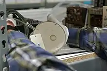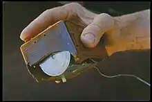 Several other experimental pointing-devices developed for Engelbart's oN-Line System (NLS) exploited different body movements – for example, head-mounted devices attached to the chin or nose – but ultimately the mouse won out because of its speed and convenience.[30] The first mouse, a bulky device (pictured) used two potentiometers perpendicular to each other and connected to wheels: the rotation of each wheel translated into motion along one axis.[31] At the time of the "Mother of All Demos", Engelbart's group had been using their second-generation, 3-button mouse for about a year.
