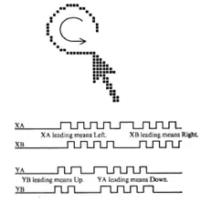 Simple logic circuits interpret the relative timing to indicate which direction the wheel is rotating. This incremental rotary encoder scheme is sometimes called quadrature encoding of the wheel rotation, as the two optical sensors produce signals that are in approximately quadrature phase. The mouse sends these signals to the computer system via the mouse cable, directly as logic signals in very old mice such as the Xerox mice, and via a data-formatting IC in modern mice. The driver software in the system converts the signals into motion of the mouse cursor along X and Y axes on the computer screen.