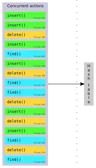 std::unordered_mapinterface. Included within are the concurrent unordered multimaps, which allow multiple values to exist for the same key in a concurrent unordered map.[11] Additionally, concurrent hash maps are provided which build upon the concurrent unordered map and further allow concurrent erasure and contain built-in locking.[12] - growt provides concurrent growing hash tables for C++ on the basis of the so-called folklore implementation. Based on this non-growing implementation, a variety of different growing hash tables is given. These implementations allow for concurrent reads, inserts, updates (notably updating values based on the current value at the key) and removals (based upon updating using tombstones). Beyond that, variants on the basis of Intel TSX are provided. The library is available on GitHub.[1][13]