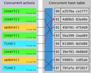 A concurrent hash table or concurrent hash map is an implementation of hash tables allowing concurrent access by multiple threads using a hash function.[1][2]
