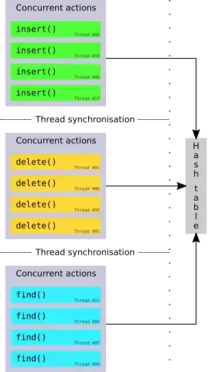 A phase concurrent hash table groups accesses by creating phases in which only one type of operation is allowed (i.e. a pure write-phase), followed by a synchronization of the table state across all threads. A formally proven algorithm for this is given by Shun and Blelloch.[2]