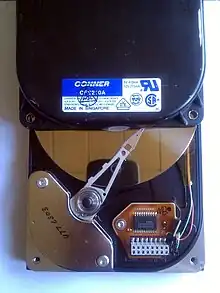 Conner Peripherals, Inc. (commonly referred to as Conner), was a company that manufactured hard drives for personal computers. Conner Peripherals was founded in 1985[1] by Seagate Technology co-founder and San Jose State University alumnus Finis Conner (1943– ).[2] In 1986, they merged[3] with CoData, a Colorado start-up founded by MiniScribe founders Terry Johnson and John Squires.[4] CoData was developing a new type of small hard disk that put the capacity of a 5.25-inch drive into the smaller (and now commonplace) 3.5-inch format.[4] The CoData drive was the first Conner Peripherals product. The company was partially financed by Compaq, who was also a major customer for many years.
