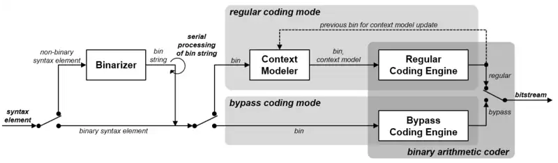 - Arithmetic encoding: An arithmetic coder encodes each bin according to the selected probability model. Note that there are just two sub-ranges for each bin (corresponding to "0" and "1").
