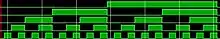 A decade counter counts in decimal digits, rather than binary. A decade counter may have each (that is, it may count in binary-coded decimal, as the 7490 integrated circuit did) or other binary encodings. A decade counter is a binary counter designed to count to 1001 (decimal 9). An ordinary four-stage counter can be easily modified to a decade counter by adding a NAND gate as in the schematic to the right. Notice that FF2 and FF4 provide the inputs to the NAND gate. The NAND gate outputs are connected to the CLR input of each of the FFs.".[1] It counts from 0 to 9 and then resets to zero. The counter output can be set to zero by pulsing the reset line low. The count then increments on each clock pulse until it reaches 1001 (decimal 9). When it increments to 1010 (decimal 10), both inputs of the NAND gate go high. The result is that the NAND output goes low, and resets the counter to zero. D going low can be a CARRY OUT signal, indicating that there has been a count of ten.