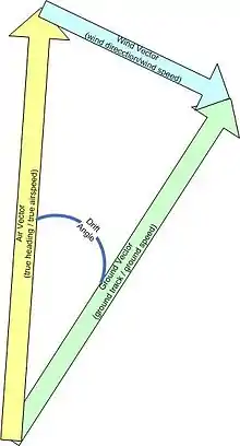The problem for the bomber is to approach a target located at the tip of the green arrow, compared to its current position at the base of the arrow. A powerful[lower-alpha 4] wind is blowing from just off the port wing of the aircraft, blowing towards about 120 degrees. If the aircraft simply points toward the target, along the green arrow, the wind will cause it to drift to the right. In order to approach the target properly, the aircraft needs to turn to the left until the portion of its airspeed equal to the wind speed cancels out the drift.[31] The resulting direction is represented by the yellow arrow in the diagram above.