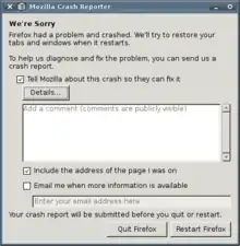 Talkback (also known as the Quality Feedback Agent) was the crash reporter used by Mozilla software up to version 1.8.1 to report crashes of its products to a centralized server for aggregation or case-by-case analysis.[8] Talkback is proprietary software licensed to the Mozilla Corporation by SupportSoft. If a Mozilla product (e.g. Mozilla Firefox, Mozilla Thunderbird) were to crash with Talkback enabled, the Talkback agent would appear, prompting the user to provide optional information regarding the crash. Talkback does not replace the native OS crash reporter which, if enabled, will appear along with the Talkback agent. Talkback has been replaced by Breakpad in Firefox since version 3.