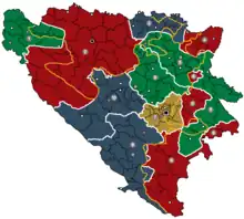 There was a change in the presidency of the HDZ BiH during winter, probably under influence of the Croatian leadership.[42] On 2 February, Kljuić had resigned. Tuđman commented that "[he] disappeared under Alija Izetbegović's fez and the HDZ [BIH] [...] stopped leading an independent Croatian policy".[43] Milenko Brkić, who also supported an integral Bosnia and Herzegovina, became the new president of HDZ BiH.[42] Bosnian Croat authorities in predominately Croat-populated municipalities answered more to the HDZ leadership and the Zagreb government than the Bosnian government.[44] The HDZ held important positions in the Bosnian government including the premiership and the ministry of defence, but despite this carried out a separate policy.[45]