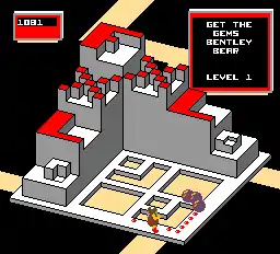 In the original arcade game, the player controls Bentley with a trackball throughout a maze of 16 different playing fields. Bentley can also jump, by pressing a button, which allows him to avoid obstacles.[3] The player can collect the gem stones scattered through the maze to gain points. Because some enemies eat gems, players can earn bonus points for collecting the last gem on the board. Other items appear, such as pots of honey, that give bonus points.[5] Different enemies follow unique patterns, such as trees who try to find the quickest path to Bentley and are stunned briefly if Bentley jumps over them. The Gem Eaters can be defeated if Bentley runs into them while a gem stone is rising up through their body.[6] Each level has four waves; the fourth one features Berthilda the Witch, whom Bentley can defeat when he wears the magic hat located in the maze. The hat otherwise makes Bentley briefly invincible to enemies.[3][6] In the game's ending, the players receive a congratulatory message and ranking based on how many lives they have and a bonus score based on how fast they played, followed by an animation that reproduces animated rectangles.[7]