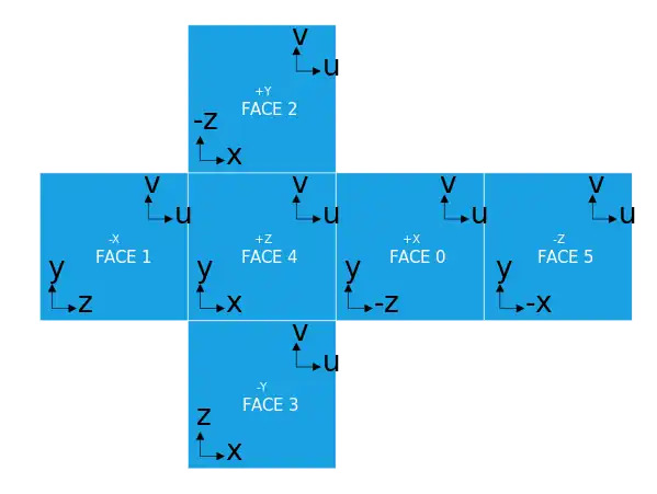 A cube texture indexes six texture maps from 0 to 5 in order Positive X, Negative X, Positive Y, Negative Y, Positive Z, Negative Z.[4][5] The images are stored with the origin at the lower left of the image. The Positive X and Y faces must reverse the Z coordinate and the Negative Z face must negate the X coordinate. If given the face, and texture coordinates , the non-normalized vector can be computed by the function: