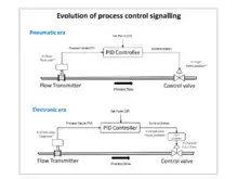 A major application of current loops is the industry de facto standard 4–20 mA current loop for process control applications, where they are extensively used to carry signals from process instrumentation to proportional–integral–derivative (PID) controllers, supervisory control and data acquisition (SCADA) systems, and programmable logic controllers (PLCs). They are also used to transmit controller outputs to the modulating field devices such as control valves. These loops have the advantages of simplicity and noise immunity, and have a large international user and equipment supplier base. Some 4–20 mA field devices can be powered by the current loop itself, removing the need for separate power supplies, and the "smart" Highway Addressable Remote Transducer (HART) Protocol uses the loop for communications between field devices and controllers. Various automation protocols may replace analog current loops, but 4–20 mA is still a principal industrial standard.