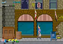 The game was issued on Sega's System 16-B which is built around the M68000 and uses a Z80 and a YM2151 for amplified mono sound generation. The System 16 pinout is not JAMMA compatible but JAMMA adaptors are available and fairly common. The game was released in a dedicated two player cabinet and also as a kit that contained the System 16 to JAMMA adaptor. Each player requires one start button, one joystick, and three action buttons (shoot, jump, special weapons). This game utilizes a standard resolution arcade monitor.