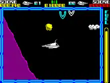 The player controls a spaceship trapped on a planet inhabited by hostile aliens. The goal is to upgrade the spaceship with parts scattered around the planet and mine a valuable element called "Cybernite".[1] The atmosphere above ground is populated by flying aliens and clouds that drip acid, damaging the ship's shields. The ship requires fuel to fly, and once exhausted will bounce along the ground of the planet unable to climb. A similar enemy ship is also on the planet attempting to mine the Cybernite before the player. Fuel can be replenished by tankers on the planet surface, but damaged shields cannot be repaired. The player must venture into caverns below the surface in order to mine the Cybernite, which can only be done once the ship has been upgraded to include a mining laser. Once sufficient Cybernite has been collected, the player can escape to the next planet in the Zebarema system.