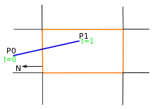 In computer graphics, the Cyrus–Beck algorithm is a generalized algorithm for line clipping. It was designed to be more efficient than the Cohen–Sutherland algorithm, which uses repetitive clipping.[1] Cyrus–Beck is a general algorithm and can be used with a convex polygon clipping window, unlike Cohen-Sutherland, which can be used only on a rectangular clipping area.