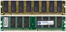 A DIMM, or Dual In-Line Memory Module, is a popular type of memory module used in computers. It is a printed circuit board with one or both sides (front and back) holding DRAM chips and pins.[1] The vast majority of DIMMs are standardized through JEDEC standards, although there are proprietary DIMMs. DIMMs come in a variety of speeds and sizes, but generally are one of two lengths - PC which are 133.35 mm (5.25 in) and laptop (SO-DIMM) which are about half the size at 67.60 mm (2.66 in).[2]