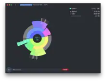 DaisyDisk displays the contents as a color-coded sunburst diagram, resembling the petals of a daisy.[12] The interface places the root of the hard drive at the center of this daisy, and displays a hierarchical structure of that hard drive's file system that radiates from that center. This daisy is color-coded to differentiate between folders, while files themselves are always displayed as gray. In the right sidebar of the interface, DaisyDisk also provides a legend for these color codes. When hovering over a file or folder, the right sidebar of the interface updates with contextual information such as the file or folder name and their absolute path.[13] When clicking on a folder on the daisy, a new daisy is displayed with the chosen folder as its root. The interface shows a "breadcrumb trail" of the current folder right above the sunburst diagram.[6]