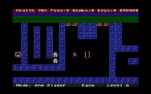 Dandy takes place in a maze-like dungeon, seen from an overhead view. The goal is to reach the exit in each dungeon and warp to the next. Dungeons are labeled "A" (the first) through "Z". Portions of the mazes are blocked by locked doors, which can be opened with keys found throughout each level.