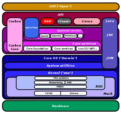 Darwin is the core Unix operating system of macOS (previously OS X and Mac OS X), iOS, watchOS, tvOS, iPadOS, visionOS, and bridgeOS. It previously existed as an independent open-source operating system, first released by Apple Inc. in 2000. It is composed of code derived from NeXTSTEP, FreeBSD,[3] other BSD operating systems,[6] Mach, and other free software projects' code, as well as code developed by Apple.