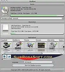 DasBoot is a software utility produced by SubRosaSoft.com Inc. It allows the user to create a bootable Mac OS X USB device for Mac OS X 10.5 and earlier. It is a freeware product. This live USB device can be used for diagnostic, repair, and recovery of Mac OS X systems.