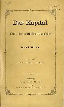Capital. A Critique of Political Economy. Volume I: The Process of Production of Capital (German: Das Kapital. Kritik der politischen Ökonomie Erster Band. Buch I: Der Produktionsprocess des Kapitals) is the first of three treatises that make up Das Kapital, a critique of political economy by the German philosopher and economist Karl Marx. First published on 14 September 1867, Volume I was the product of a decade of research and redrafting and is the only part of Das Kapital to be completed during Marx's life. It focuses on the aspect of capitalism that Marx refers to as the capitalist mode of production or how capitalism organises society to produce goods and services.